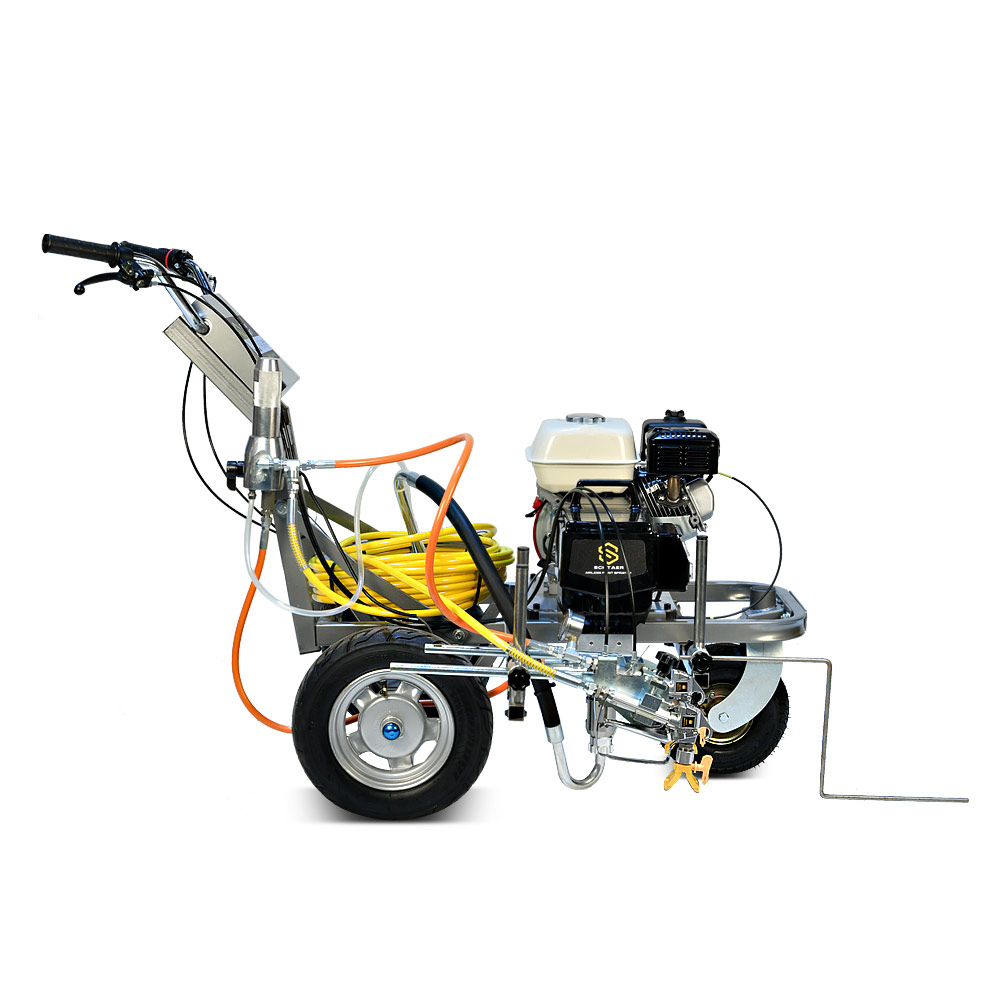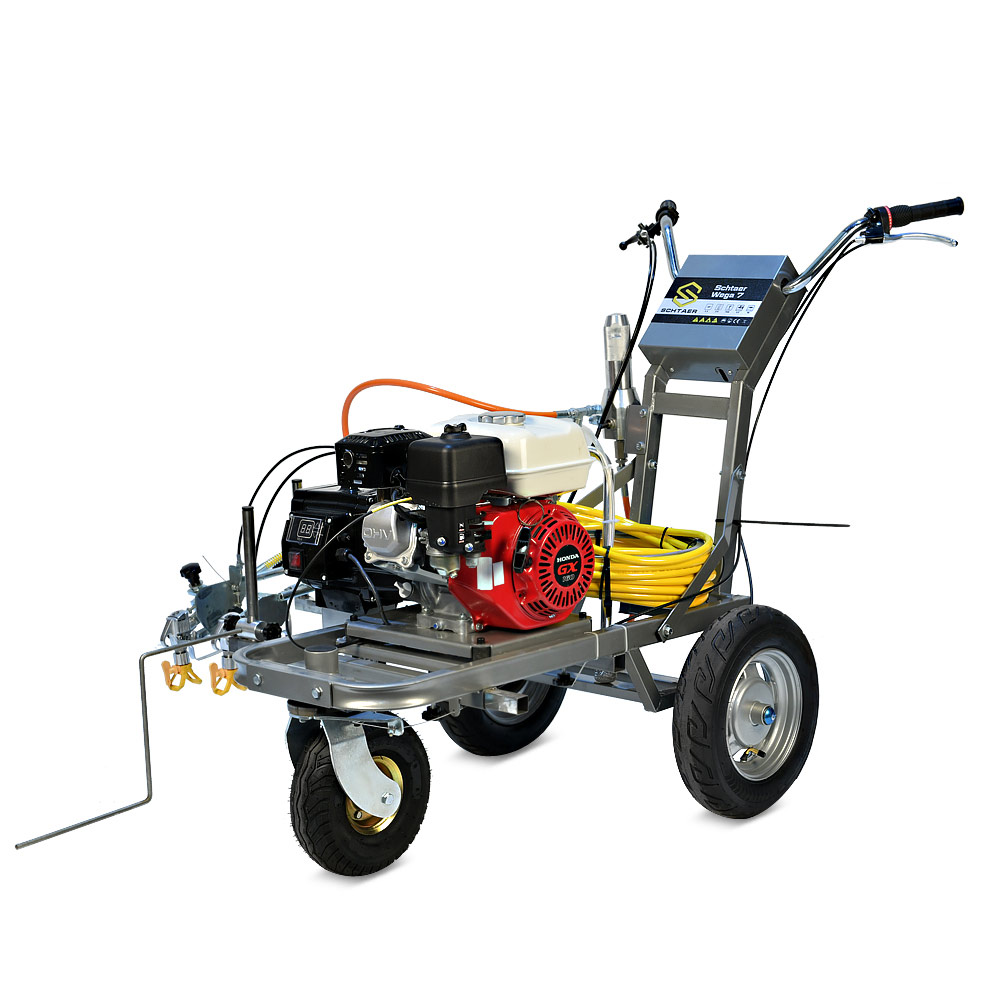 Schtaer WEGA 7 - разметочная машина для безвоздушного нанесения дорожной разметки краской на асфальт. Разметочная машина собрана на базе поршневого насоса для краски и бензинового двигателя. Машину для нанесения дорожной краски можно толкать, также ее можно использовать как подающий поршневой насос с бензиновым двигателем и держать машину в кузове грузовика, и наносить краску окрасочным пистолетом вручную по шаблону. Машина может наносить как прямые линии, так прерывистые. Также, благодаря переднему поворотному колесу, можно наносить радиусы, фиксируя переднее колесо под нужным углом. Машина может наносить двойные сплошные и прерывистые линии, пешеходные переходы. Максимальная длина шланга 90 метров. Сопло 1908.