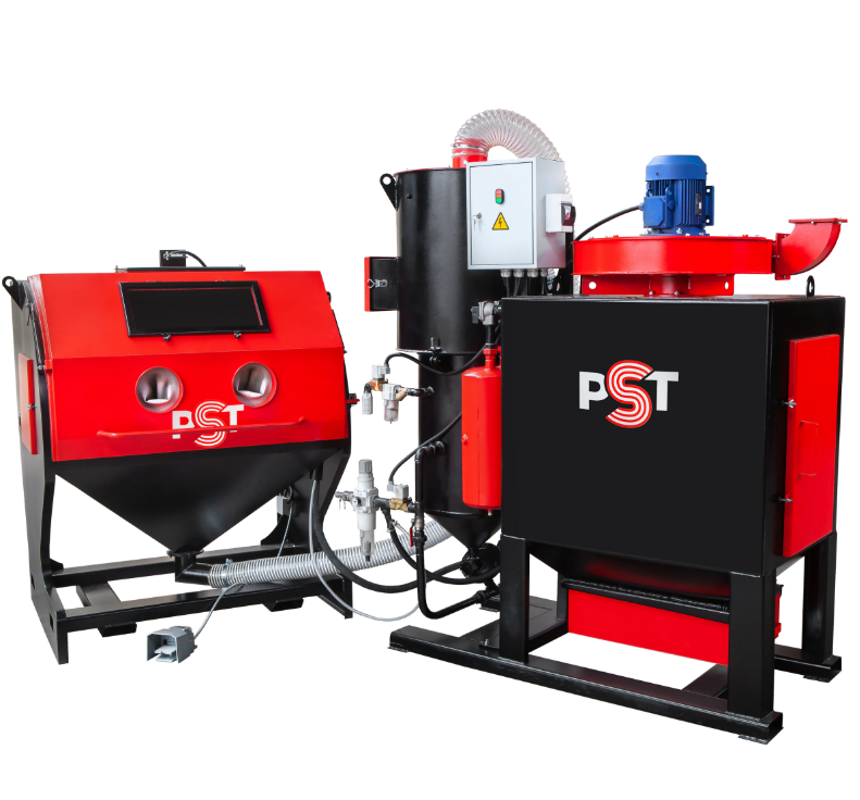 Напорная пескоструйная камера PST отличается от инжекторной способом транспортировки абразива к соплу внутрь камеры. Напорный тип этих установок характеризуется высокой мощностью воздушно-абразивной струи, скоростью вылета ее частиц, поэтому в ней можно обрабатывать больше изделий за единицу времени, чем в инжекторной, производить глубокую очистку в труднодоступных местах изделия.