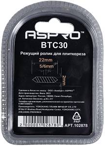 Режущий элемент ASPRO-BTC30 для плиткореза изготовлен из высокостойкого твёрдого сплава на основе карбида вольфрама с покрытием из нитрида титана. Он имеет посадочное отверстие диаметром 5/6 мм, диаметр резца 22 мм и толщину резца 2 мм. Этот режущий элемент предназначен для использования в ручном плиткорезе и системе резки крупноформатной плитки.